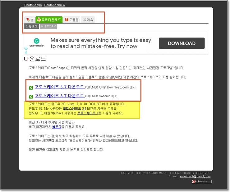 아래 그림은 포토스케이프 홈페이지 화면이네요. 모양새는 조금 허접해 보이지만, 카테고리에서 '무료다운로드' 클릭 후 체크박스 된 링크 사이트로 연결하면 되네요. 설치 후 실행하면 가장 최신 버전이 설치된다는 설명입니다.