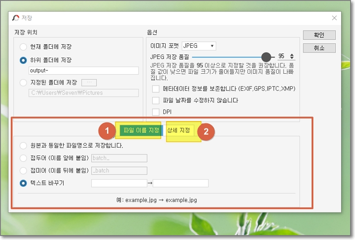 저장할 폴더와 파일 형식까지 설정했으니 일괄 편집한 이미지의 파일 이름을 지정할 차례입니다. 지정방법은 "파일이름지정"과 "상세 지정" 중 택해서 이름을 지정하면 됩니다.