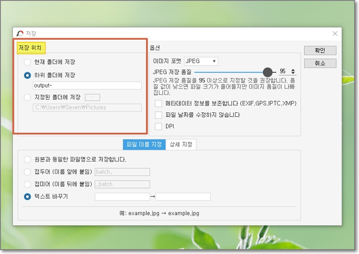 "파일이름저장" 방법은 4가지가 있네요. 동일한 파일명, 접두어+파일명, 파일명+접미어, 이름 바꾸기 중 선택하면 됩니다.