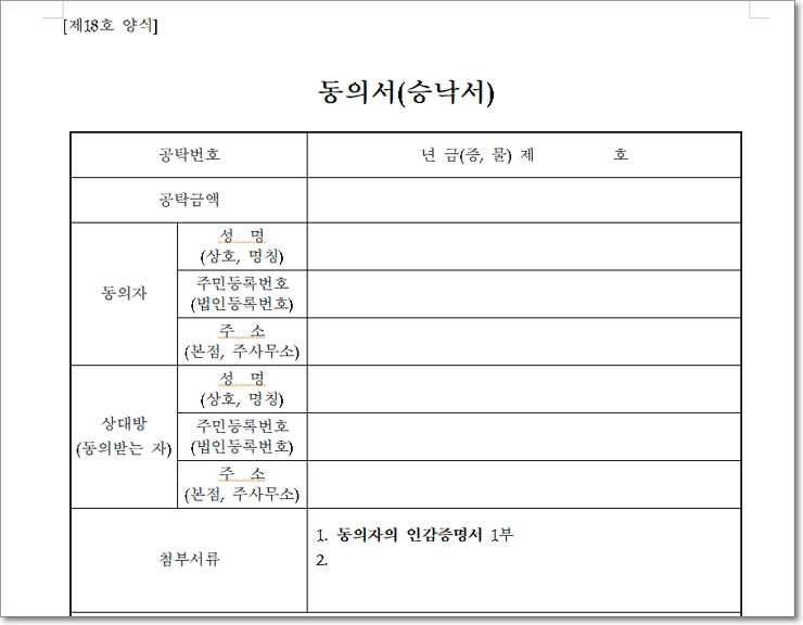 첨부하는 파일은 법원 공탁관에게 제출하는 공탁금 승낙에 대한 동의서 양식입니다. 규정된 서식이므로 빈 내용을 작성 후 인감증명서를 첨부합니다.