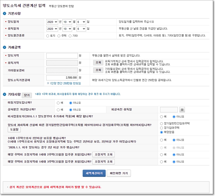 체크 항목은 크게 어렵지 않으니 정확하게 선택하면 될 겁니다. 안내 문구에 나와있듯이 실제 양도세 세액과는 차이가 있을 수 있으니 정확한 금액은 세무전문가나 관할 세무서에서 확인해야겠지요.