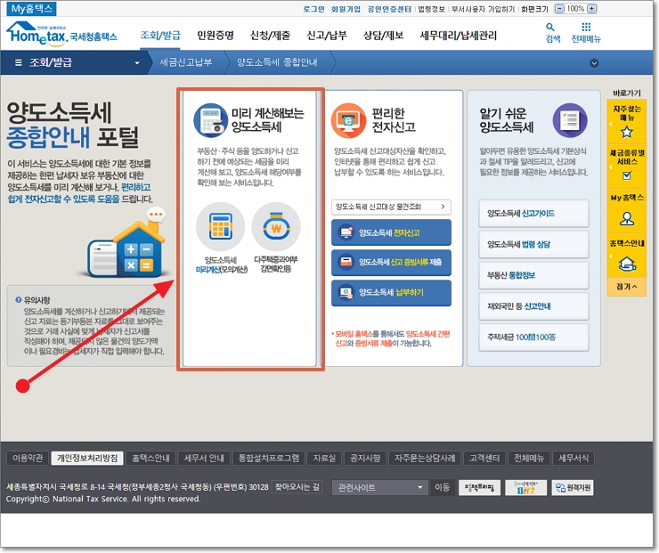 양도소득세 자동계산을 위해 홈택스에 접속한 메인화면입니다. "미리 계산해보는 양도소득세"창을 클릭하면 됩니다. 자동계산 중 [미리 계산(모의계산)] 또는 [다주택 중과여부 감면 확인 등]에서 원하는 항목을 클릭하면 됩니다.