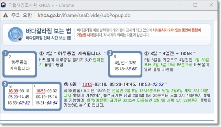 예보 달력에 표시된 시간의 색깔에 따라 자세히 설명되어있네요. 적색과 흑색, 청색 표기된 시각에 따라 통행 가능 여부를 확인할 수 있습니다.