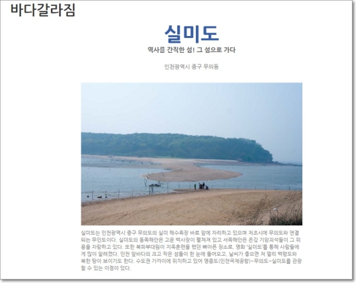 현상이 일어나는 곳 중 "실미도"를 클릭한 화면입니다. 저조 시에 무의도와 연 될 되는 무인도라는 설명이 나오네요. 이처럼 지명을 클릭하면 바다 갈라지는 곳 관광, 여행 정보가 같이 나옵니다.