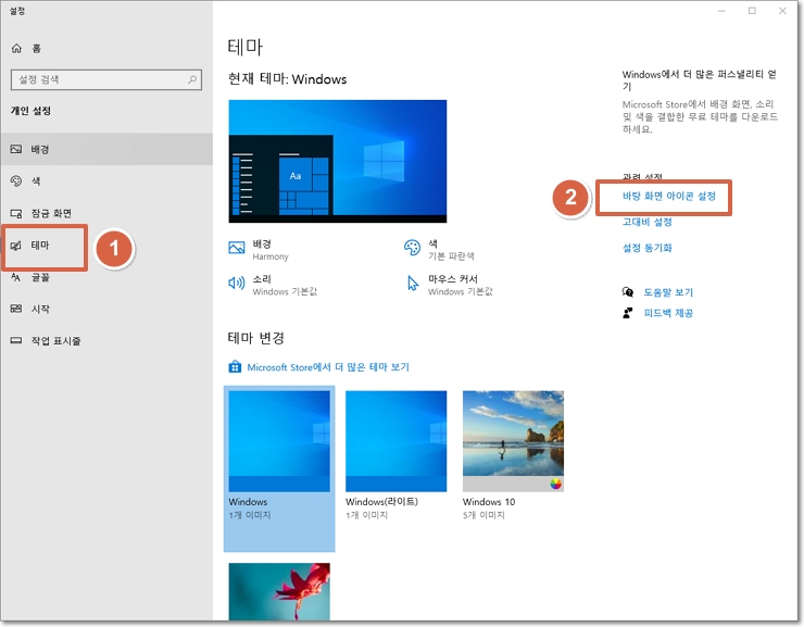 개인설정 창 좌측 메뉴 중 "테마"를 클릭합니다. 우측 관련설정에서 "바탕화면 아이콘 설정"을 클릭합니다.