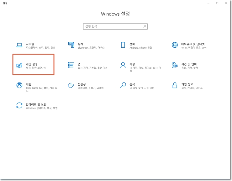 Window 설정 목록 중 "개인설정"을 클릭하면 됩니다.