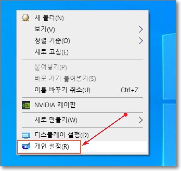 아래 그림은 바탕화면에서 마우스 우클릭 상태입니다. 나타나는 메뉴 중 "개인설정"을 선택하면 됩니다.