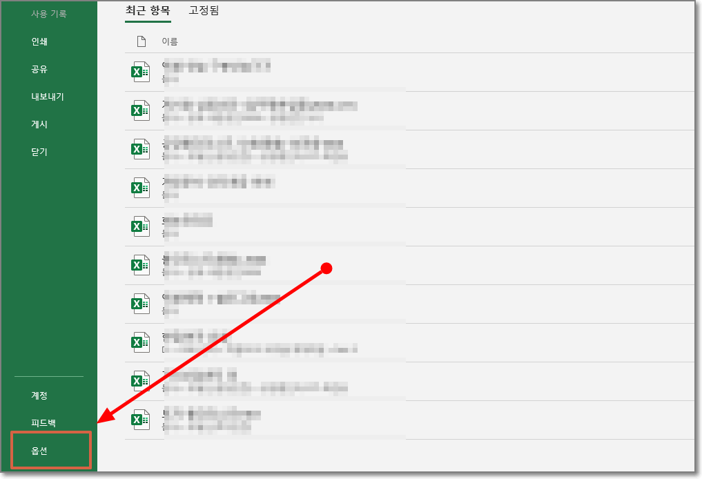 왼쪽 하단 부분의 "옵션"항목을 클릭하면 엑셀 옵션 대화상자가 나타납니다.
