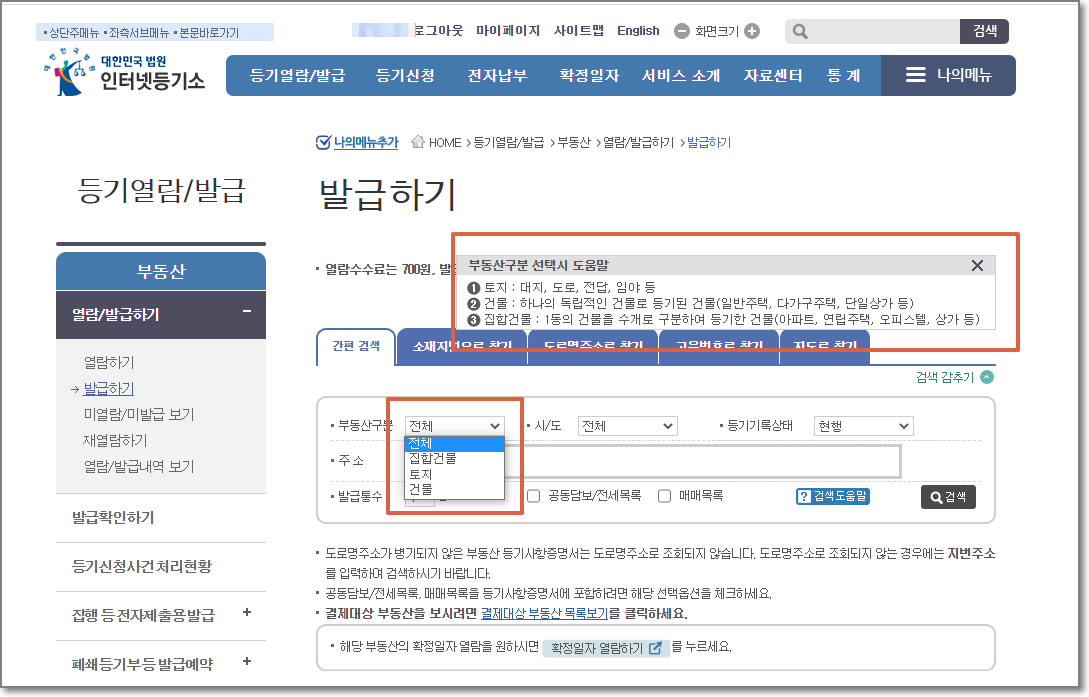 대법원 인터넷등기소 등기열람/발급 화면에서 부동산 구분 선택이 있습니다.